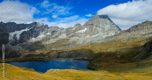 Matterhorn reflected in an alpine lake with clear water, rocky shoreline, and surrounding high altitude terrain in Switzerland. Mountain landscape showing iconic peak, glacial environment, natural sym
