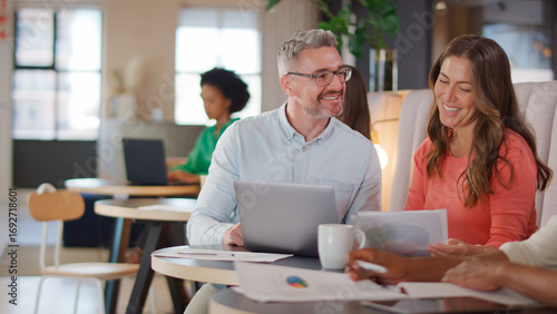 Mature Businesswoman And Businessman Working On Laptop In Informal Seating Area Of Modern Office