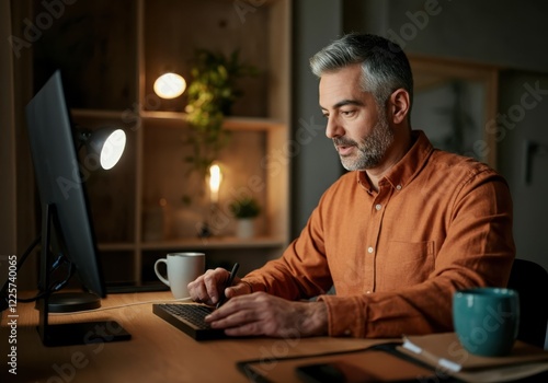 mature, caucasian, male, computer, office, workspace, desk, concentration, sharpened, thoughtful, tech, cup, plant, digital, work, shirt, beard, home, lamp, design, creative, environment, monitor, professional, organised, technology, typing, study, evening, soft, light, mug, productive, interior, remote, telecommuting, serious, attentive, screen, relaxed, modern, freelance, career, lifestyle, task, analysis, thinking