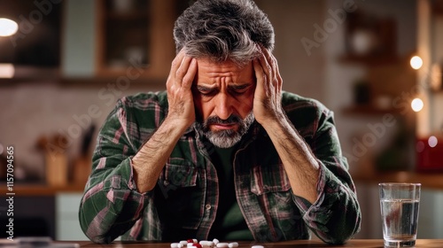 man, mature, pill, concern, home, caucasian, adult, medicine, contemplation, anxiety, beard, plaid, health, stress, goggles, countertop, hand, indoor, depression, casual attire, mental, fatigue, new year, health care, grey, setting, day, middle-aged, medication, remedy, pondering, interior, recovery, morning, living, sorrowful, hangover, emotional, male, sleepy, aspirin, introspection, detox, choice, environment