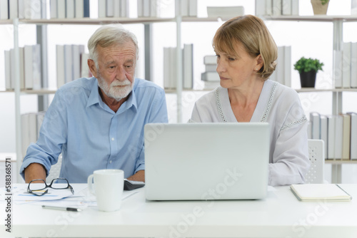 Mature couple looking at finance document and data on laptop computer and having a money problems