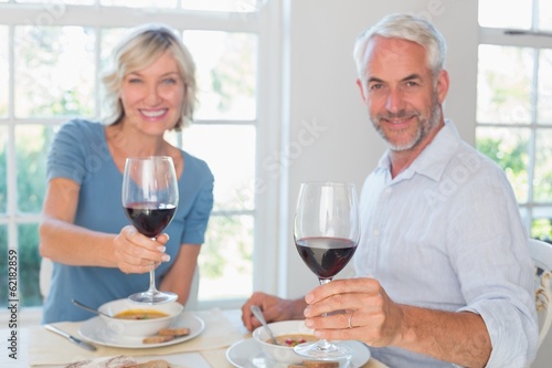 mature adult, woman, female, caucasian, man, male, sitting, house, home, apartment, domestic, lifestyle, togetherness, food, lunch, meal, portrait, table, bright, window, wine, red wine, wine glass, alcohol, drink, plate, bowl, smiling, happy, photogenic, beautiful, pretty, indoor