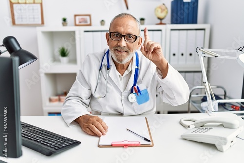 Mature doctor man at the clinic pointing finger up with successful idea. exited and happy. number one.