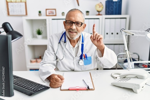 Mature doctor man at the clinic showing and pointing up with finger number one while smiling confident and happy.