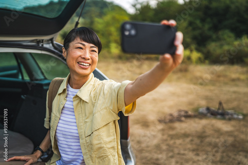 woman, mature, japanese, car, mobile phone, travel, camping, good news, communicate, cyberspace, wireless, talk, technology, vacation, person, day, nature, backpack, automobile, holiday maker, camp, auto, holiday, leisure, weekend, rear, load, green, forest, rural, journey, pack, back, drive, casual attire, female, departure, go, leaving, moving, 1, concept, smile, happy, greeting