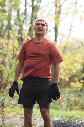 Mature man catching his breath during a run in a wooded area, dressed in sports attire with gloves and a headband.