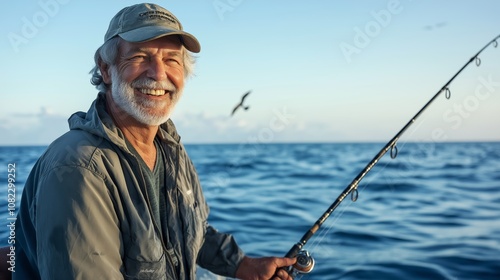 fishing, mature, man, sea, sunny, outdoors, serene, peaceful, ocean, water, beard, elderly, male, retirement, leisure, hobby, nature, relaxation, calmness, coastal, adventure, solitude, smiling, joyful, boating, rod, weather, blue, sky, horizon, marin, activity, senior, seasoned, life events, vacation, sunlight, environment, escape, exploration, nautical, lifestyle, freedom, fisherman, casual attire, grey, trip, scenery, daytime, get-away
