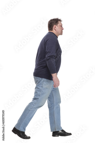 Mature man in jeans striding forward.isolated on a white background.