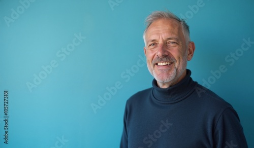 senior, portrait, happiness, confidence, retirement, beard, vibrant, turtleneck, closeup, head shot, studio, wisdom, ageing, lifestyle, joy, wrinkle, positive, energetic, healthy, active, smile, teeth, expression, friendly, welcoming, grandparent, father, masculine, teal, turquoise, blue, sweater, casual attire, copy space, background, simplicity, minimalist, optimism, vitality, contentment, mature, middle-aged, caucasian, male, fathers day