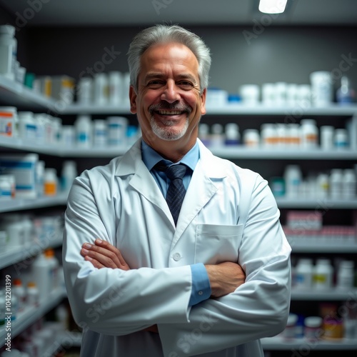 pharmacy, apothecary, portrait, adult, adults only, color image, doctor, expertise, horizontal, indoor, lifestyle, male, mature adult, man, one man only, one person, people, photo, professional occupation, smiling, working