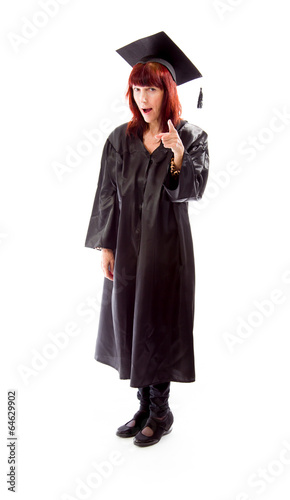 mortarboard, education, lifestyle, vertical, studio shot, life events, mature adult, blame, communication, mouth open, woman, portrait, white background, college students, standing, adults only, mature woman, human hand, gesticulate, one person, pointing, graduation, indexed, showing, human finger, color image, photo, full-length, black, front view, cut-out, scolding, caucasian appearance