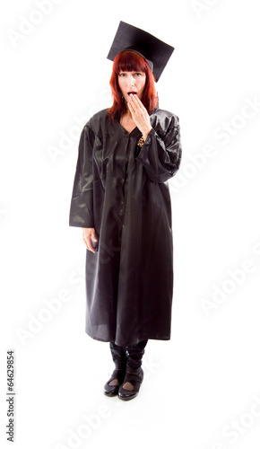 mortarboard, education, lifestyle, vertical, studio shot, life events, front view, idle, fatigue, college students, waking up, woman, mouth open, white background, portrait, graduation, standing, adults only, mature woman, human hand, color image, laziness, idleness, morning, one person, exhaustion, human mouth, covering, overworked, mature adult, yawning, photo, full-length, black, boredom, sleepy, caucasian appearance, cut-out