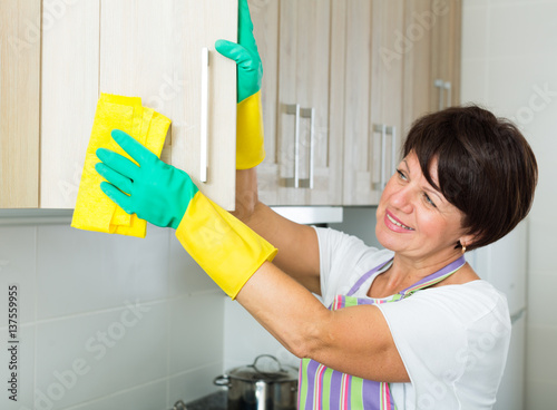 indoor, satisfied, sweeping, chore, woman, female, mature, retiree, cleaning, working, household, detergent, spray, glove, duster, cheerful, smiling, glad, home, apartment, casual attire, protective, washing, homemaker, interior, polishing, hygiene, holding, lifestyle, routine, equipment, occupation, service, caucasian, american, 50s, domestic, cleaner, rag, applying, sanitize, disinfectant, stove, furniture, surface, wet