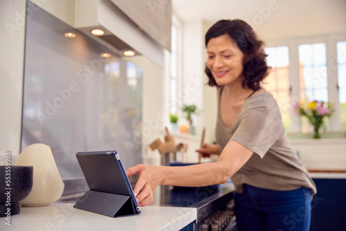 Mature Woman In Kitchen At Home Cooking Meal Following Recipe On Digital Tablet