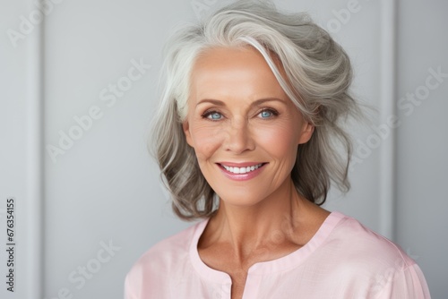 Mature woman with a beautiful smile and happy face. Adult aged woman with healthy and smooth skin. Cosmetics and beauty skincare. Generative AI