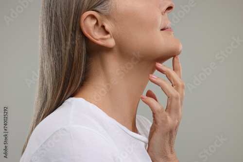 Mature woman with healthy skin on grey background, closeup