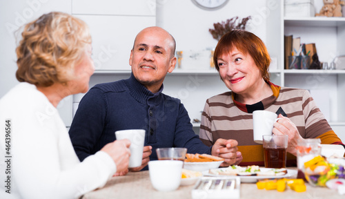 tea, mature, people, male, man, home, female, woman, talking, drinking, adult, interior, friendship, person, to sit, together, happy, old, aged, table, friends, ordinary, indoor, casual attire, european, meeting, laughing, 50s, pensioner, family, hot drink, lifestyle, smiling, retired, room, apartment, sofa, relaxing, talkative, friends, age, cup, relationship, discussion, rest, comfort