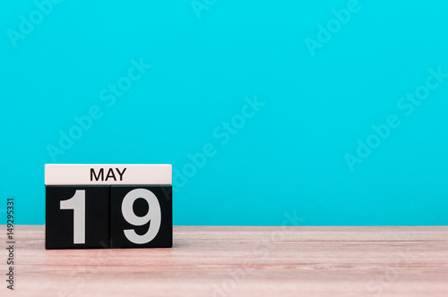 May 19th. Day 19 of month, calendar on turquoise background. Spring time, empty space for text