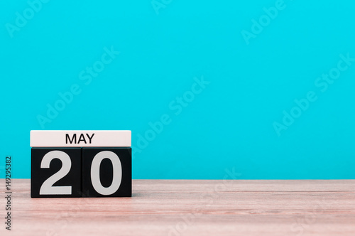 May 20th. Day 20 of month, calendar on turquoise background. Spring time, empty space for text