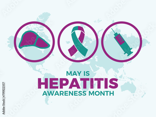 May is Hepatitis Awareness Month poster vector illustration. Purple green awareness ribbon and liver icon set vector. Template for background, banner, card. Important day