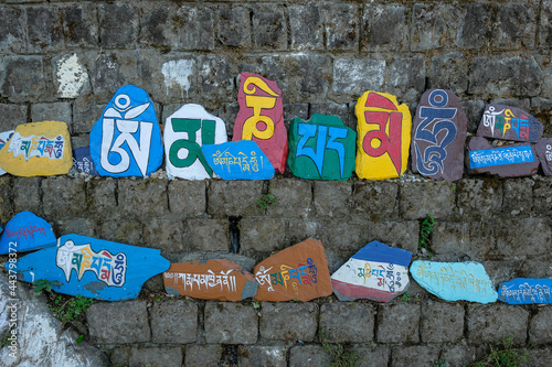 McLeod Ganj, India - May 2021: Prayer stones located around the Tsuglagkhang Complex on May 21, 2021 in Dharamshala, Himachal Pradesh, India.