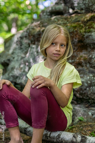 Mädchen beim unbeschwerten Sport und turnerischer Bewegen, wie Akrobatik in der Freizeit, im Wald und in der Natur. Sie trägt legere Kleidung, Shirt und Leggins.