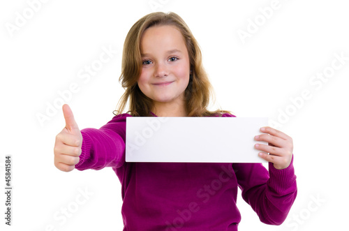 Mädchen hält Hinweisschild und zeigt Daumen hoch