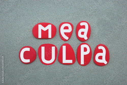 Mea culpa, phrase originating from Latin that means my fault or my mistake and is an acknowledgment of having done wrong, composed with hand painted red colored stone letters