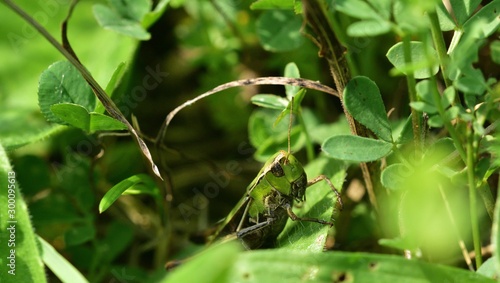 Meadow grasshopper macro of head hidden in the grass