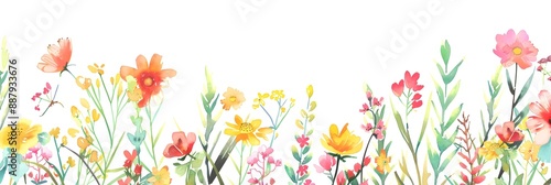 Meadow in summer. Horizontal border of adorable watercolor flowers on a white background. Drawing for a card, border, banner, or other design of yours