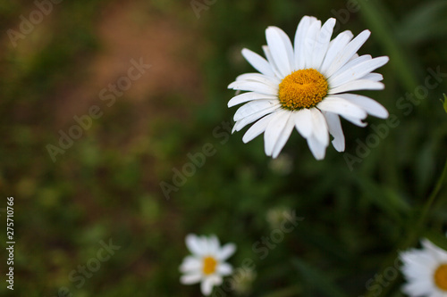Meadow with green grass and white daisy flowers.Selective focus, blurred background