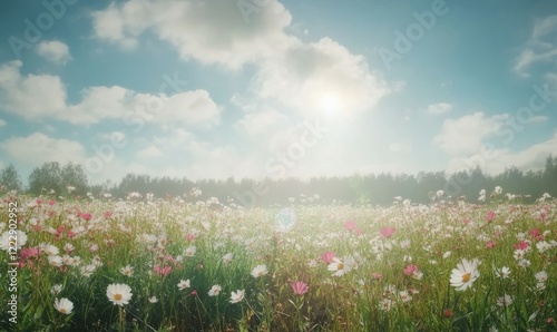 Meadow with lots of white and pink spring daisy flowers in sunny day. Nature landscape in estonia in early summer