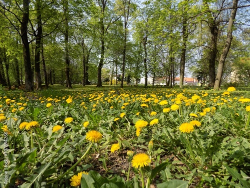 Meadow with many dandelions and deciduous trees