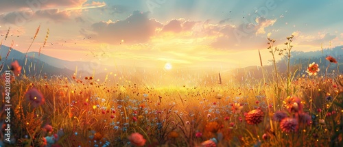 Meadow with wildflowers and tall grass, with a backdrop of rolling hills and a setting sun, Romantic, Digital painting, Vibrant colors, Peaceful atmosphere