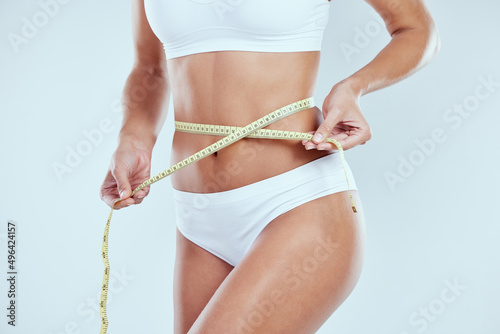 Measure up. Cropped shot of an unrecognizable young woman measuring her waist against a grey background.