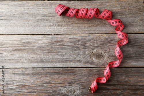 Measuring tape on grey wooden background