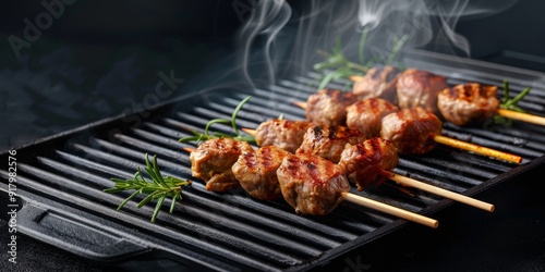 Meat Kebab on Grill with Rosemary and Smoke – Photorealistic Style by Jean Lloois, Black Background