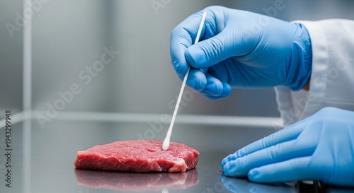 meat, safety, inspection, laboratory, test, sample, food, quality, control, laboratory, glove, swab, raw, beef, science, research, analysis, hygiene, health, protection, prevention, contamination, risk, assessment, scientist, men at work, hand, glove, equipment, facility, interior, surface, taking, testing, protocol, procedure, standard, operation, regulation, compliance, assurance, product, development, study, exam, evaluation, monitoring