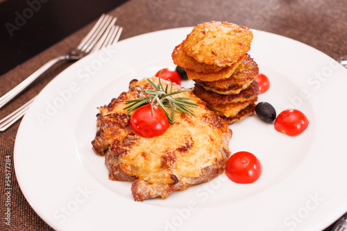 elegant, food, fork, garnish, epicure, healthy, lamb, meal, meat, plate, pork meat, portion, potato, ready, roast, roasted, salad, sliced, spice, steak, dinner, vegetable, beef, sauce, cherry tomato, cheese, onion, rosemary