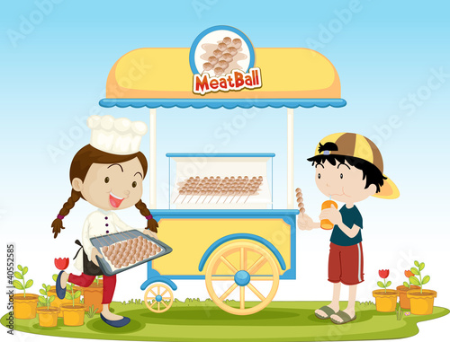 children, person, young, children, children, illustration, cute, cartoon, friends, friendship, pals, boy, male, food, stall, racked, meat, ball, meatball, thai, vietnamese, hat, cool, eating, snack, plant, wheel, cart, chef, cook, stick, girl, client, serving, waiter, waitress, vector