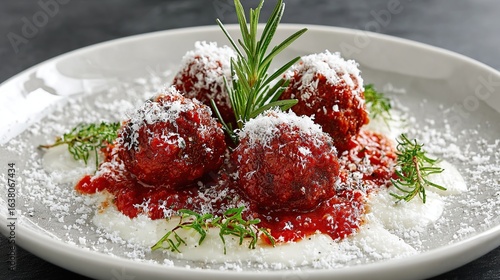 meatball, sauce, red, ricotta, parmesan, cheese, italian, food, meal, cookery, plate, grey, delicious, tasty, rosemary, garnish, herb, dinner, lunch, course, culinary, presentation, epicure, eatery, traditional, savoury, protein, meat, ground, cooked, baked, fried, spice, fresh, serving, dish, dining, homemade, classic, ingredient, nourishment, rustic, wholesome