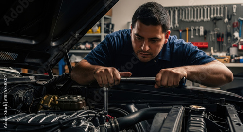 mechanic, car, engine, work, workshop, hood, tool, screwdriver, wrench, bench, torque, garage, auto, vehicle, labor, hand, sharpened, adult, male, blue, shirt, dark, compartment, cabinet, screw, bolt, hose, radiator, maintenance, repair, diagnostic, inspection, removal, installation, drill, piston, belt, cap, sensor, valva, air, fuel, coolant, metal, mechanical