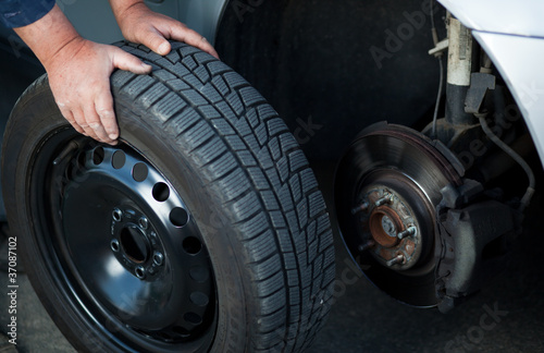 mechanic changing a wheel of a modern car