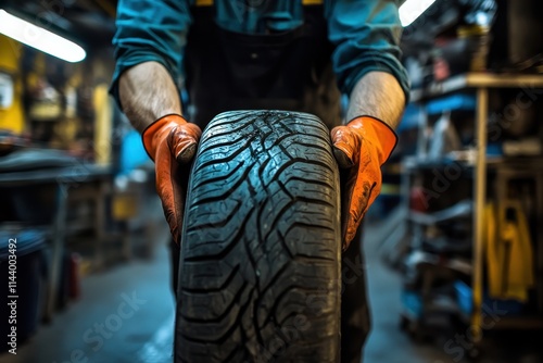 tire, auto, mechanic, repair, rubber, wheel, car, vehicle, maintenance, service, transport, transportation, road, safety, grip, tread, worn, old, new, change, replace, garage, workshop, industry, professional, hand, glove, dirty, black, asphalt, speed, journey, travel, drive, motor, engine, automotive, machinery, equipment, part, technology, business, job, men at work, man, person, skilled, expert, inspection