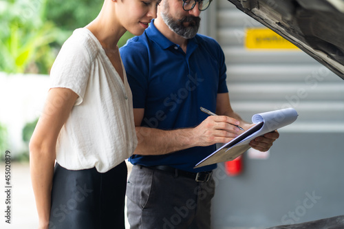 Mechanic man and woman customer check the car condition before delivery. automobile repair maintenance station garage.