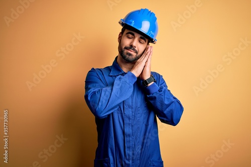 Mechanic man with beard wearing blue uniform and safety helmet over yellow background sleeping tired dreaming and posing with hands together while smiling with closed eyes.