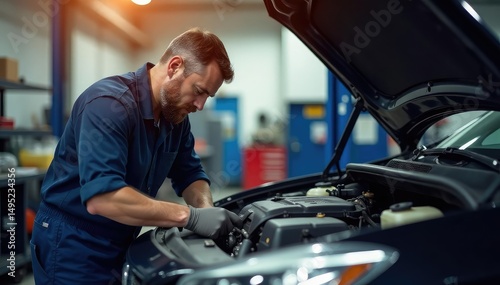 Mechanic repairing car engine in auto repair shop, tools, car