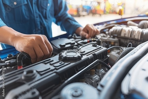 Mechanic s hands skillfully inspecting car engine with specialized tools in blurred background