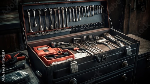 mechanic, toolbox, box, illustration, tool, auto, repair, shop, metal, wheel, mobility, mains outlet, wrench, impact, driver, diagnostic, equipment, open, organised, professional, specialized, car, workshop, maintenance, service, garage, portable, hard-wearing, efficient, storage, utility