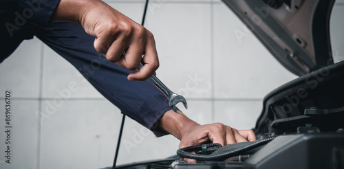 Mechanic using wrench while working on car engine outside the service center , Repair and service.